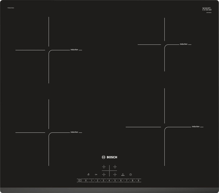 Індукційна плита завширшки 59,2 см, з 4 зонами приготування, таймером із функцією вимкнення для кожної зони, 17 рівнями потужності, 2 рівнями індикатора залишкового тепла, блокуванням від дітей і захисним вимикачем.